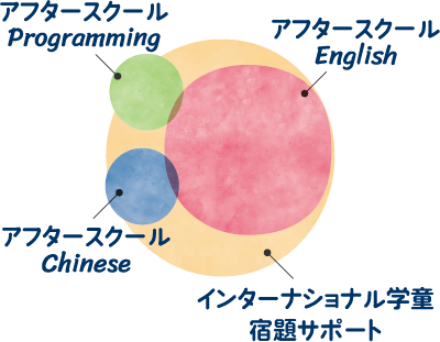 英語や中国語環境に親しみ、日常会話やゲームを通じ楽しく理解する幼児〜資格獲得を目指す学生まで、目標やレベルに合わせたレッスンを行います。英検対策に特化したクラスや中高生対象の受験英語クラスも新設!隔週金曜日に、サイエンス実験(教材費別途)を受講出来るクラスもあります。