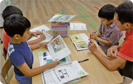 クラスの中で英語の基本である、スピーキング、リスニング、リーディング、ライティングの力をつけることができます。テキストを使ったテーマディスカッション、ゲーム、問題演習の時間も。外国人講師とフリートークを楽しんだり、歌を歌ったりと常に英語脳を働かせることができます。楽しく学び、体感し、探求心を育てます。