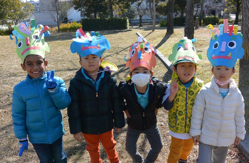 子ども達は、節分に向けて一生懸命作ってきた鬼のお面をかぶっていざ鬼退治!大きな鬼に向けて豆を投げる子どもたち!中には怖がって泣きだしてしまう子もいましたが、子どもたちの大きな掛け声によって、めでたく鬼を退治することができました。 最後は子鬼と記念撮影♪また一つ冬ならではの楽しい思い出ができました!