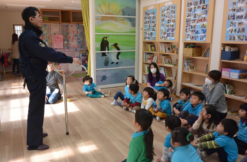 3月のTopic study のテーマである[Work and jobs]から徳重交番より、お巡りさんを園にお招きしてお話をお伺いすることができました。近くで見る制服姿に、興味津々の子どもたち!身に着けている物や、緊急詩の対応の仕方など貴重なお話を真剣な表情で聞く姿が見られました。最後には子どもたちから歌のプレゼントをして、感謝の気持ちを伝えることができました。