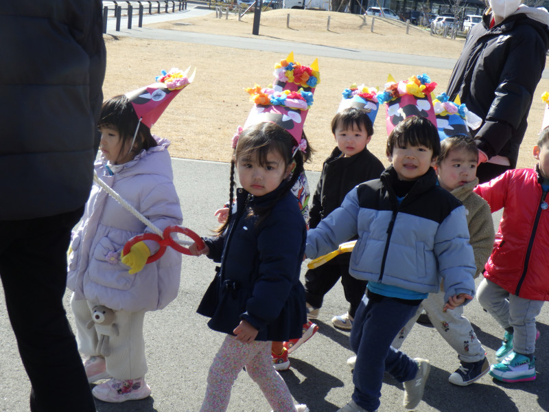 今年も節分の季節がやってきました👹 この日は、各クラスで工夫を凝らした被り物を身につけて公園へ出発!鬼のお面はもちろん、今年はなんと恵方巻きを頭に乗せたようなユニークなデザインも登場し、出発前から笑顔があふれていました♪ 公園では、節分の歌を元気いっぱいに歌い、ノリノリで楽しんでいた子どもたち。ところが……突然鬼が現れると、その場でびっくりして固まってしまう姿も。 それでも、怖さに負けず勇気を振り絞り、「Go away, Demon!」と元気に豆を投げて鬼退治!一生懸命な子どもたちの姿がとても頼もしく感じられました。 鬼が去ったあとはほっと一安心。園に戻ってからは、日本の伝統的な遊びである坊主めくりを楽しみ、最後まで笑顔いっぱいの一日となりました。 今年も子どもたちの成長を感じられる、思い出深い節分となりました✨